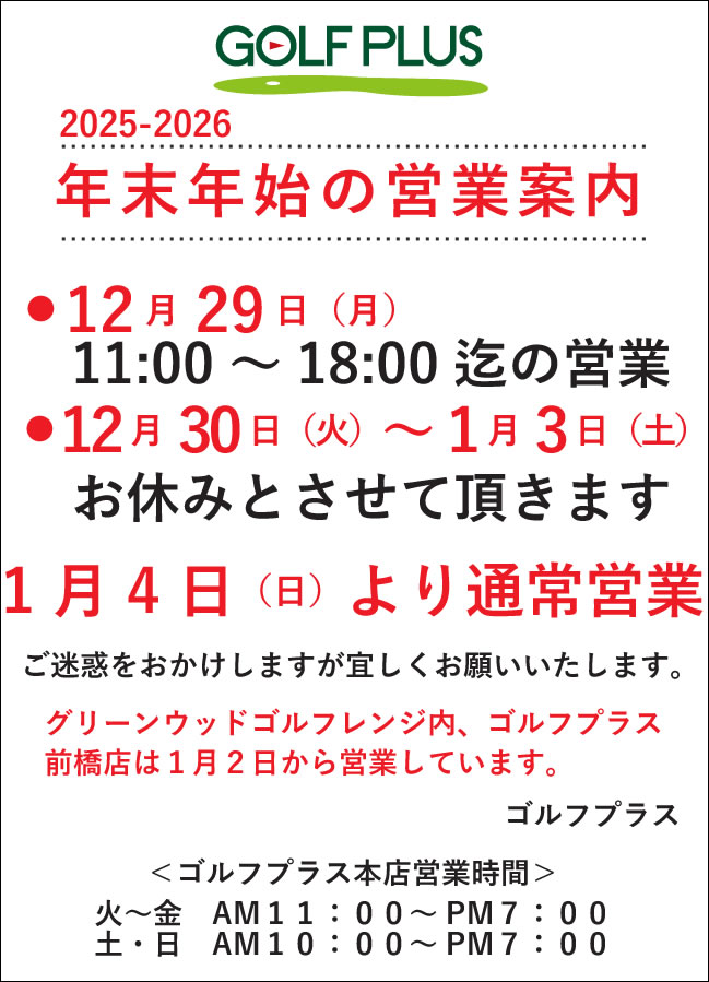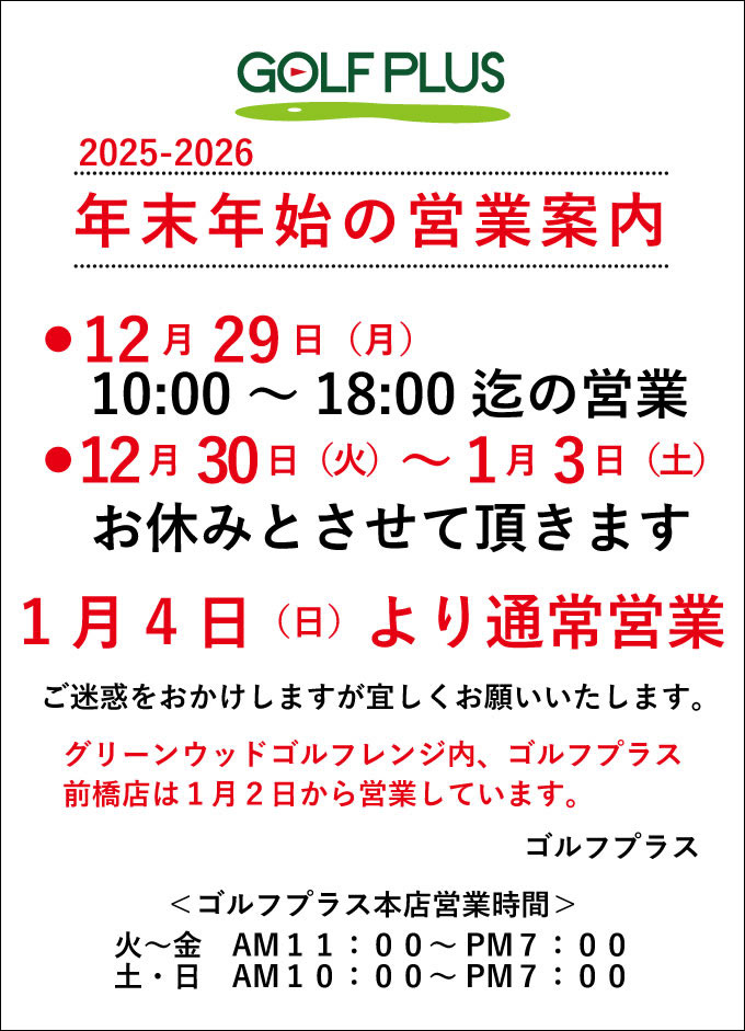 —● ゴルフプラス 25-26 年末年始営業時間 ●—